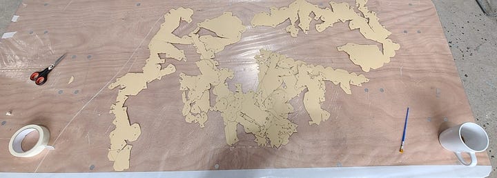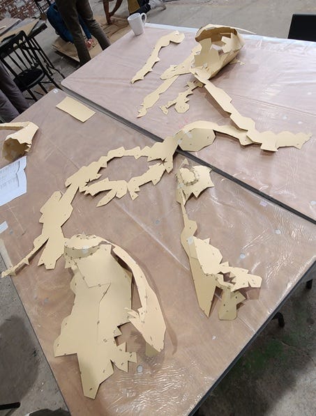 Hidden away in one of the railway arches near Mayfield Park, here was a wonderland of animals in different stages of assembly (and when I got there, it was the first week of building, so we are talking the skeleton equivalent of puppets). Us volunteers got a little tour and talk about how this works and basically invited to find a table we liked and get stuck in. We were constructing three types of puppets: wildebeasts, wolves and red deer, and they were all using laser-cut materials (a great way of getting people all over the world to help in the building effort, as only files needed to be sent). There were tables where the plywood “skeletons” were put together, some people were starting to work on the mechanisms that would allow the people to puppeteer the creatures, and others were papier macheeing a layer of ‘skin’ onto plywood. Some people cut out multiple layers of cardboard antlers to glue together into a three-dimensional shape, and others made tails for the wolves that seemed almost fluffy.