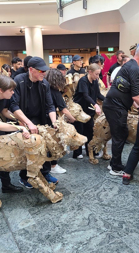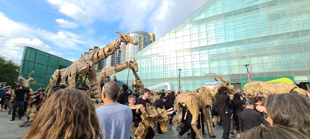 The Manchester International Festival is back this year, and by far the most interesting project this time round (for me, at least) was The Herds - a public arts project that raises awareness of the climate crisis by sending animal puppets made out of cardboard on a journey from the Congo basin to the Arctic Circle (via Manchester). Animals native to Africa started, and as they travelled North, trying to escape an environment heating up, one herd was joined by others, growing as a group.