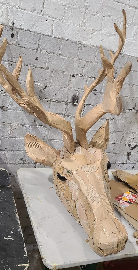Honestly, I had so much fun, I came back three times, also putting together our ‘first’ wolf and red deer head, working on finishing up all the faces, and then at my last visit I helped papier machee some of the heads, some of the bodies, and painted some of the hooves.